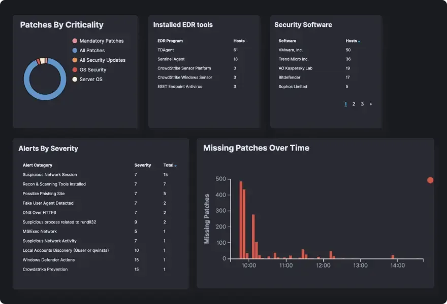 • You will get visibility into active network connections, executed processes, user logons, vulnerable software, and more.